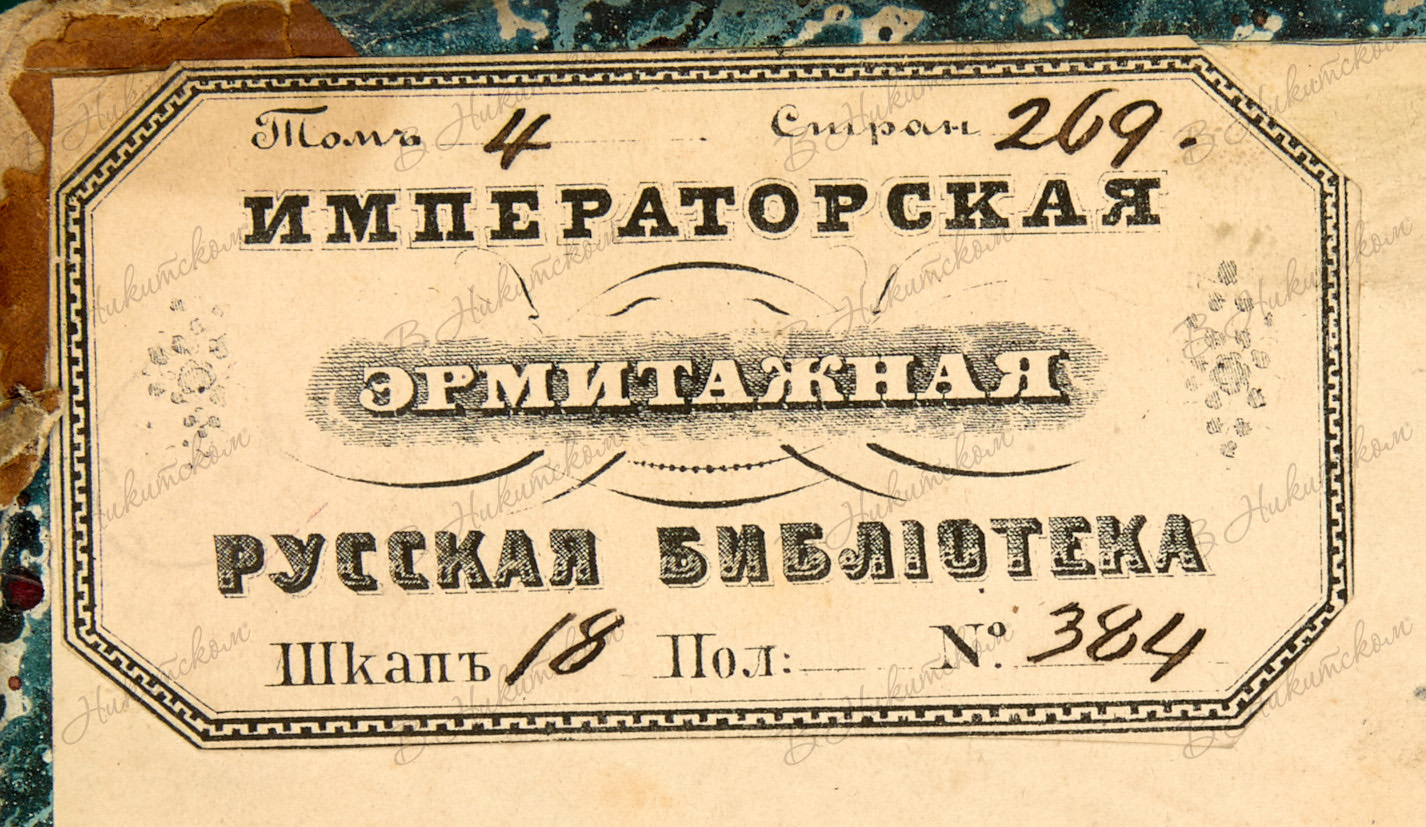 Кн. 1: 244, [1], 245-247, V c. 24,8 х 16,3 см. В полукожаном переплете эпохи с золотым тиснением по корешку. Потертости переплета, мелкий надрыв внизу корешка, следы залития блока, на с. 170 маленькое отверстие (след от огня, задето одно слово). На форзаце 1а бумажный экслибрис «Императорская Эрмитажная русская библиотека», на титуле дореволюционный штамп «Придворной российской библиотеки».