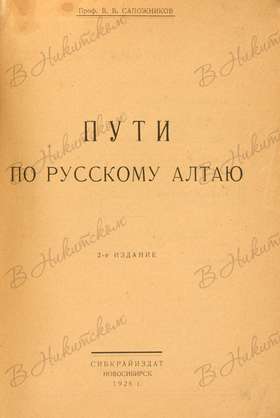 Проф. Сапожников, В.В. Пути по русскому Алтаю. 2-е издание. Новосибирск: СИБКРАЙИЗДАТ, 1926.