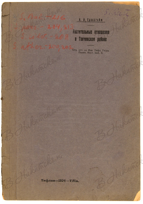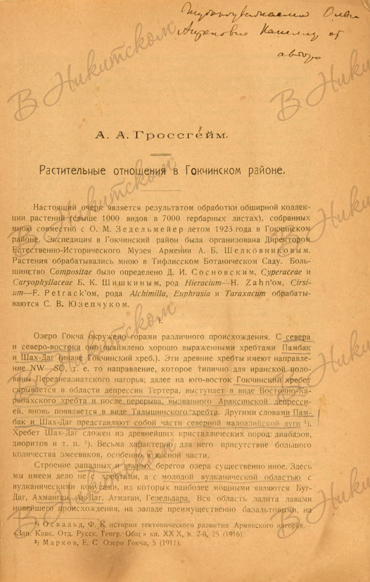 Гроссгейм, А.А. [Автограф]. Растительные отношения в Гокчинском районе. Тифлис. 1926.