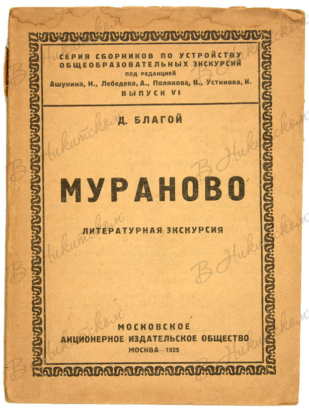 1. Благой, Д. Мураново. Литературная экскурсия. М.: Московское Акционерное Издательской Общ-во, 1925. 80 с., ил. 17,7 х 13,2 см. В орнаментированной издательской обложке. Следы залития обеих сторонок обложки, а также блока по верхним полям. Небольшие надрывы и фрагментарные утраты на корешке.