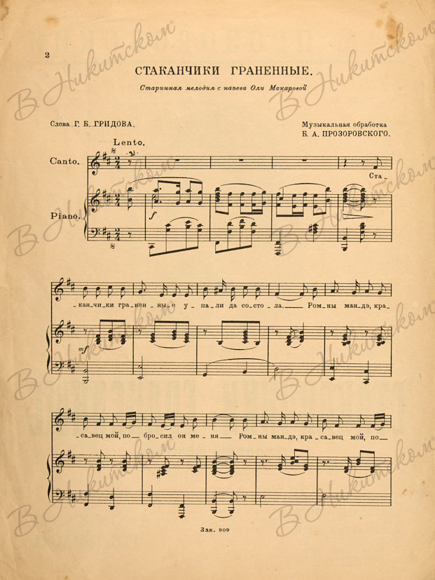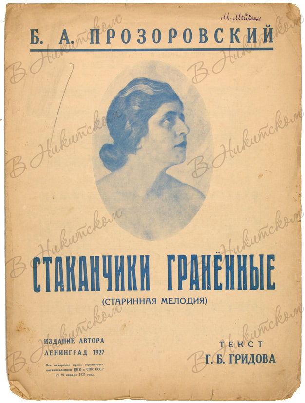 2. Прозоровский, Б.А. Стаканчики гранённые. (Старинная мелодия) / Текст Г.Б. Гридова. М.: Издание автора, 1928. 4 с. (включая обложку), ноты. 35,5 х 26,3 см. В иллюстрированной издательской обложке. Загрязнения, мелкие надрывы страниц.