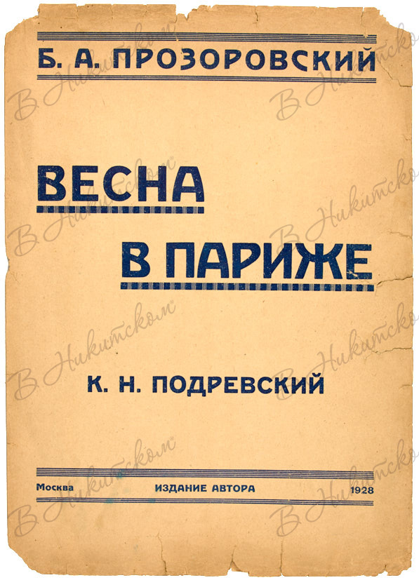 1. Прозоровский, Б.А, Весна в Париже. М.: Издание автора, 1928. 4 с. (включая обложку), ноты. 37 х 26 см. В издательской обложке. Надрывы, замятости, утрата небольших фрагментов страниц.