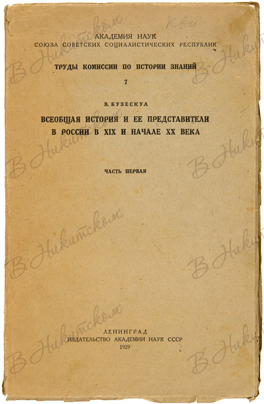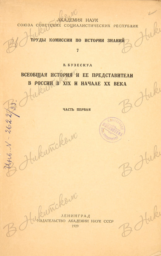 [Серия «Академия наук СССР. Труды комиссии по истории знаний»]. Вып. 7. Бузескул, В. Всеобщая история и её представители в начале XX века. Ч. 1. Л.: Издательство Академии Наук СССР, 1929.