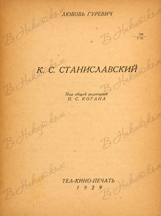 Гуревич, Л. К.С. Станиславский / под общей редакцией П.С. Когана. М.: ТЕАКИНОПЕЧАТЬ, 1929.