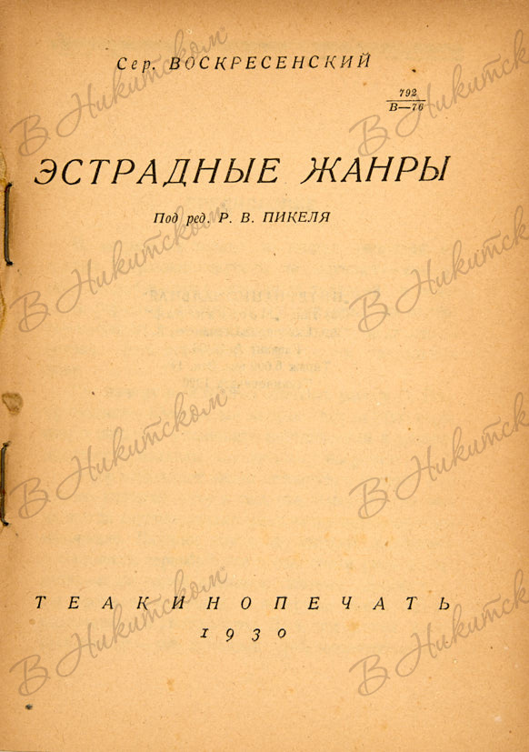 Воскресенский, С. Эстрадные жанры / под ред. Р.В. Пикеля. М.: ТЕАКИНОПЕЧАТЬ, 1930.