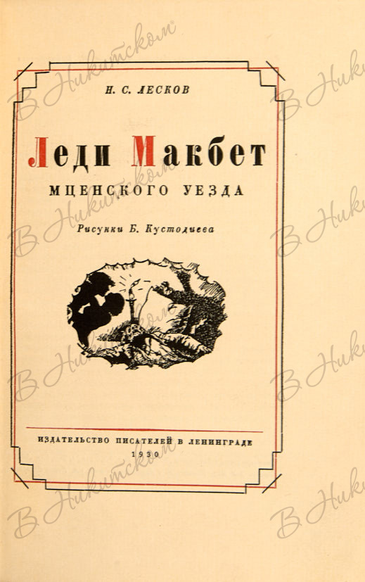 Лесков, Н. Леди Макбет Мценского уезда / рис. Б. Кустодиева. Л.: Изд-во писателей в Ленинграде, 1930.