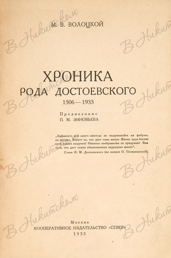 Волоцкой, М.В. Хроника рода Достоевского. 1506-1933 / предисл. П.М. Зиновьева. М.: Север, 1933.