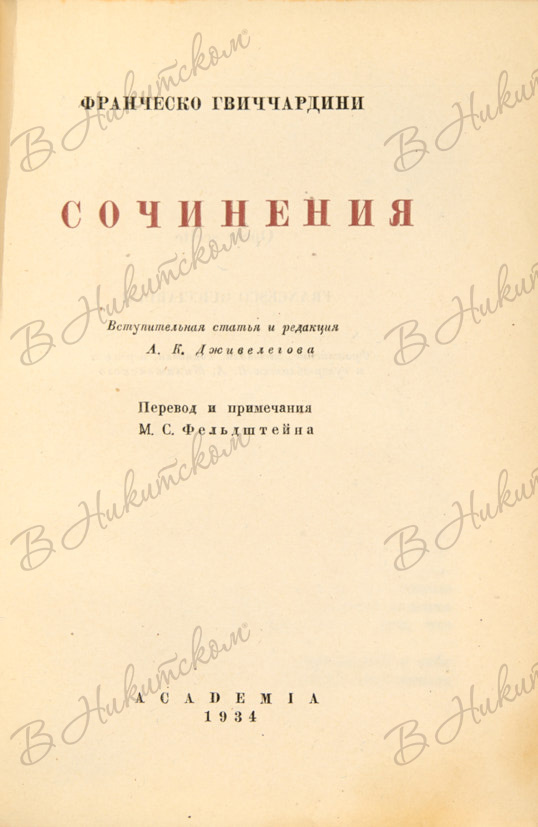 Гвиччардини, Ф. Сочинения / ред. А. Дживелегова, пер. М. Фельдштейна, оформ. В. Милашевского. М.; Л.: Academia, 1934.