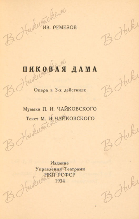 2. Пушкин, А.С. Пиковая дама. Опера в 3-х действиях / Музыка П.И. Чайковского. Текст М.И. Чайковского. М.: Издание Управления Театрами НКП РСФСР, 1934. 68, [4] с., 9 л. ил. 14,3 х 9,8 см. В орнаментированной издательской обложке. Потертости, незначительные загрязнения обложки.
