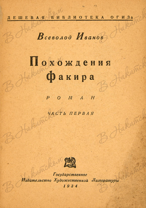 [Серия «Дешёвая библиотека» ОГИЗа]. Иванов, В. Похождение факира. Роман. [В 2 ч.]. Ч. 1. Л.: ГИХЛ, 1934.