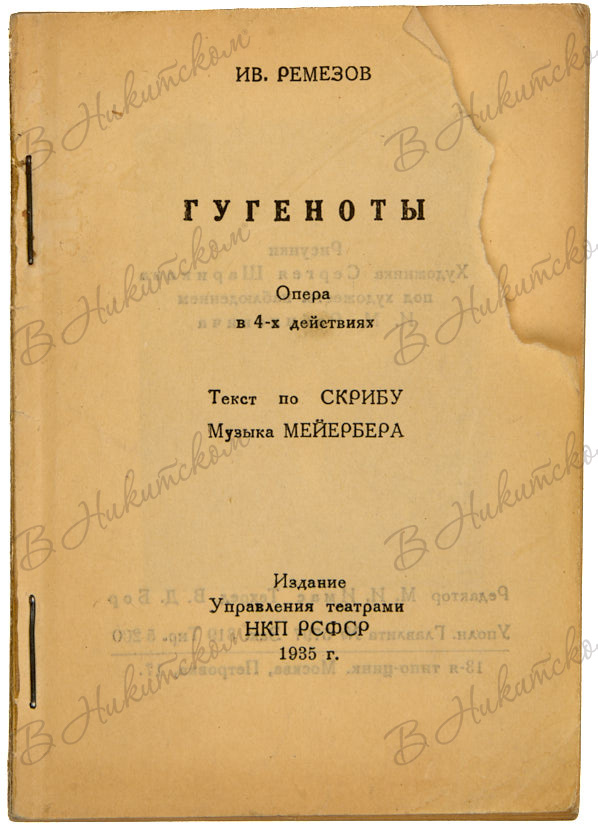 Ремезов, И. Гугеноты. Опера в 4-х действиях. Текст по Скрибу. Музыка Мейерберга / рис. С. Шарикова. М.: Издание Управления театрами НКП РСФСР, 1935.