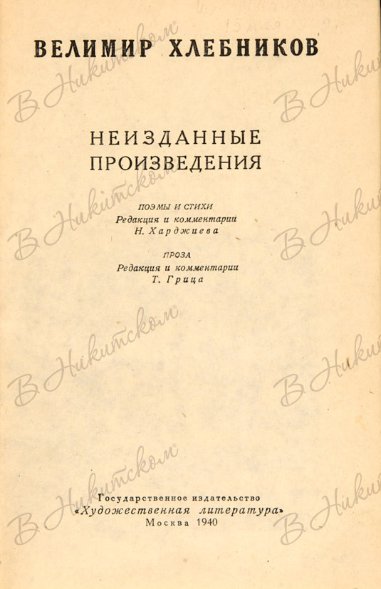 Велимир Хлебников. Неизданные произведения. Поэмы и стихи / Редакция и комментарии Н. Харджиева. Проза / Редакция и комментарии Т. Грица. М.: «Художественная литература», 1940.
