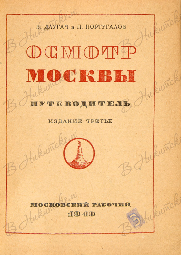 Длугач, В. Португалов, П. Осмотр Москвы. Путеводитель. Издание 3-е. М.: Московский рабочий, 1940.