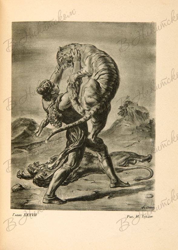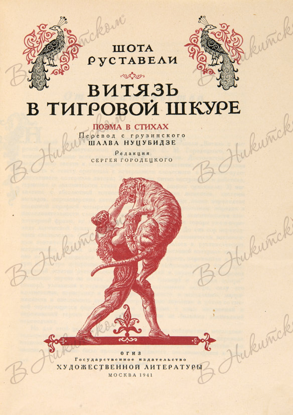 Руставели, Ш. Витязь в тигровой шкуре. Поэма в стихах / пер. с груз. Шалва Нуцубидзе; ред. Сергея Городецкого, [ил.: Зичи, С. Кобуладзе и И. Тоидзе]. М.: Гослитиздат, 1941.