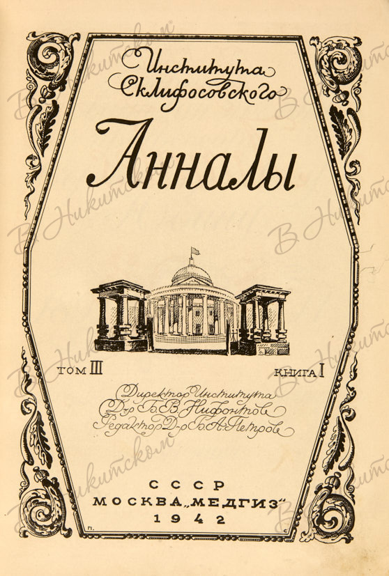 [Экземпляр хирурга Н.В. Антелава]. Анналы Института Склифосовского. Т. III. Кн. 1. / Директор Института д-р. Б.В. Нифонтов; ред. д-р. Б.А. Петров. Анналы Института Склифосовского. Т. III. Кн.1. / Директор Института д-р. Б.В. Нифонтов. Ред. д-р. Б.А. Петров. М.: МЕДГИЗ, 1942.