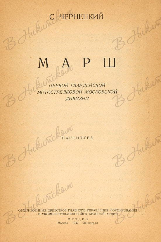 1. Чернецкий, С. Марш Первой Гвардейской Мотострелковой Дивизии. Партитура. М.; Л.: Отдел Военн. Оркестров Главн. Управл. Форм. и Укомпл. Войск Кр. Армии; МУЗГИЗ, 1942. 28 с., ноты. 25,8 х 17,2 см.