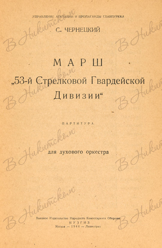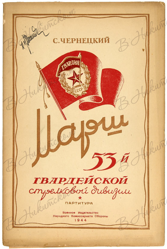 2. Чернецкий, С. Марш 53-й Гвардейской Стрелковой Дивизии. Партитура. М.; Л.: Военн. Изд. Нар. Ком. Обороны, 1944. 26 с., ноты, 2 л. нот. 25 х 18 см. В иллюстрированной орнаментированной издательской обложке. В очень хорошем состоянии.