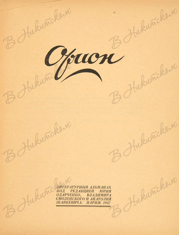 Орион. Литературный альманах / под ред. Юрия Одарченко, Владимира Смоленского и Анатолия Шайкевича. Париж: Amour, 1947.