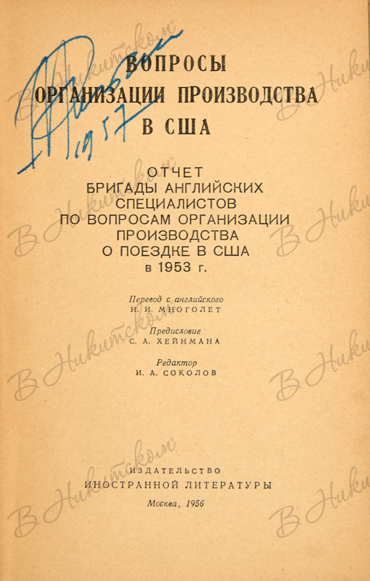 Вопросы организации производства в США. Отчет бригады английских специалистов по вопросам организации производства о поездке в США в 1953 г. / пер. с англ. Н.И. Многолет, предисл. С.А. Хейнмана, ред. И.А. Соколов. М.: Изд-во иностранной литературы, 1956.