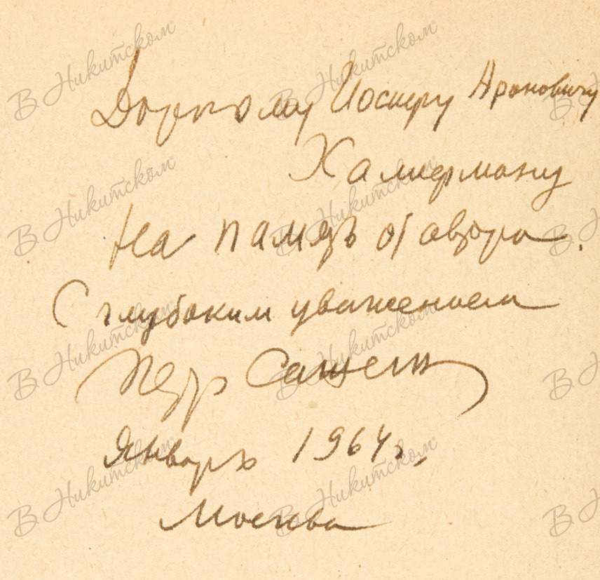 654, [2] с. 20,7 х 13,5 см. В картонажном издательском иллюстрированном переплете, тканевый корешок. Потертости крышек и корешка, надлом переднего форзаца. Корешок отстает от блока. Замятость нижнего уголка с. 653-654. На форзаце 2а автограф автора: «Дорогому Иосифу Ароновичу / Хамерману / На память от автора. / С глубоким уважением / Петр Сажин / Январь 1964 г. / Москва».