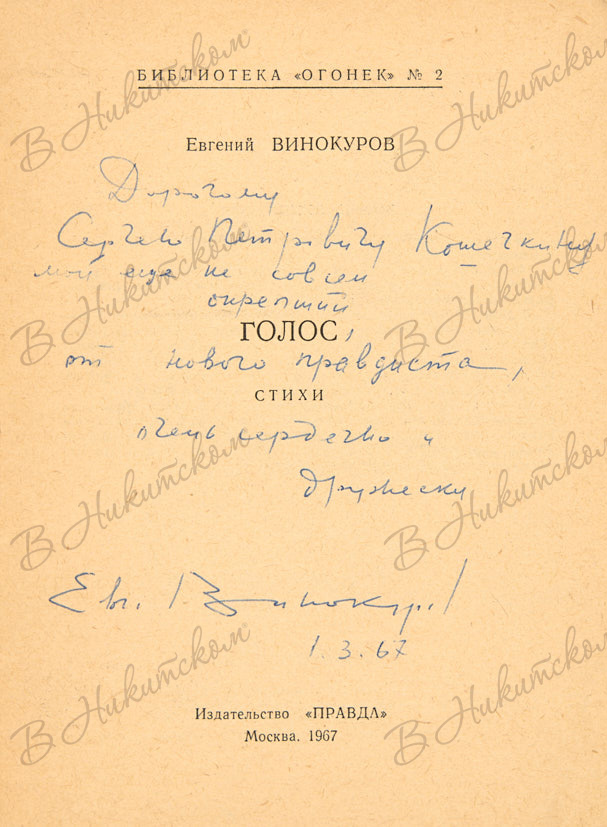 [Серия «Библиотека «Огонёк»»]. № 2. Винокуров, Е. [Автограф поэту и литературоведу С.П. Кошечкину]. Голос. Стихи. М.: Издательство «Правда», 1967.