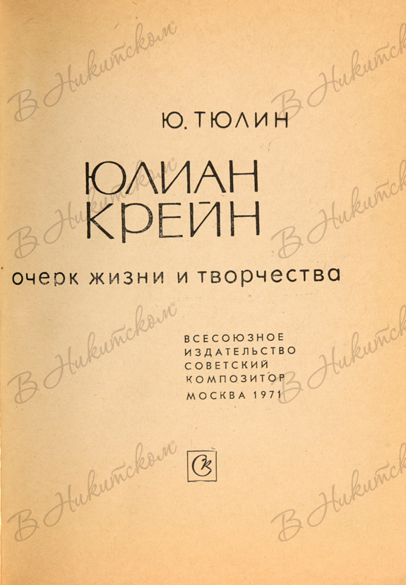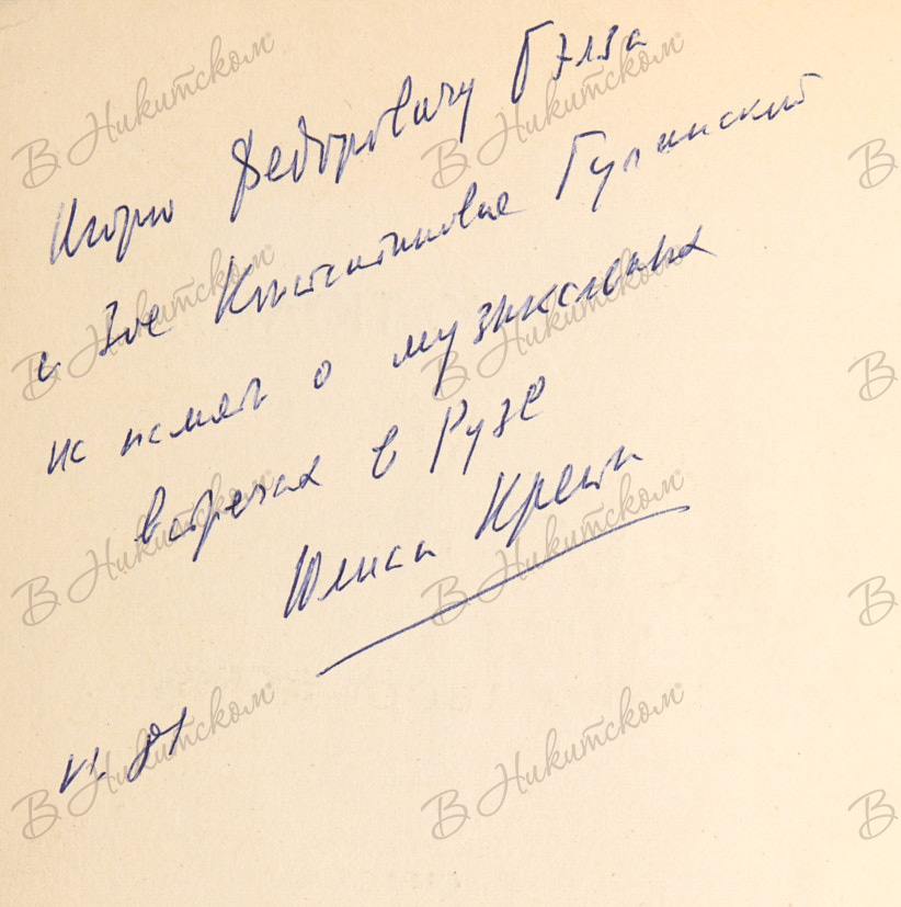 Тюрин, Ю. [Автограф И.Ф. Бэлза]. Юлиан Крейн. Очерк жизни и творчества. М.: «Советский композитор», 1971.
