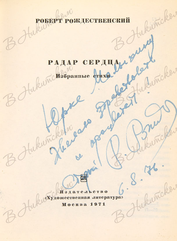 Рождественский, Р. [Автограф]. Радар сердца. Избранные стихи. М.: Художественная литература, 1971.