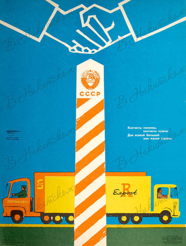[Плакат творческого объединения «Боевой карандаш»]. Контакты полезны, контакты нужны / худ. Н. Баев, стихи Б. Лезунова. Л.: Художник РСФСР, 1977.