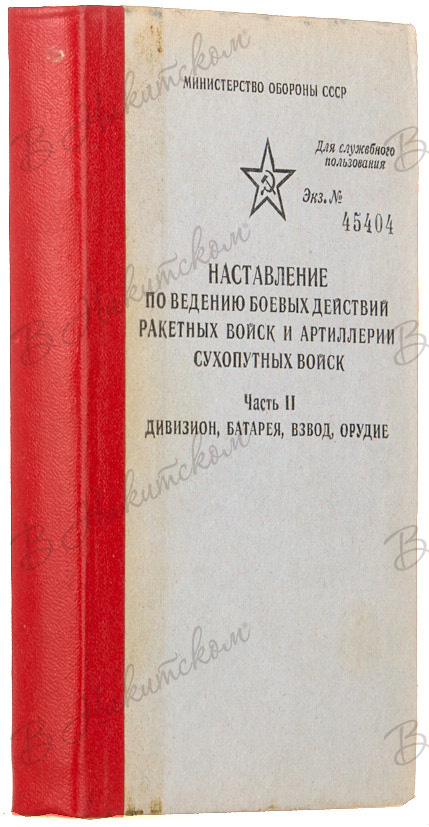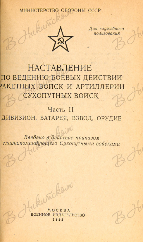 [Экземпляр № 45404 для служебного пользования]. Наставление по ведению боевых действий ракетных войск и артиллерии сухопутных войск. Ч. 2. Дивизион, батарея, взвод, орудие. М.: Воениздат, 1983.