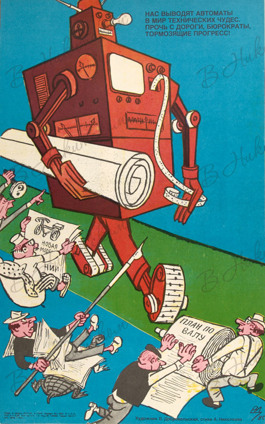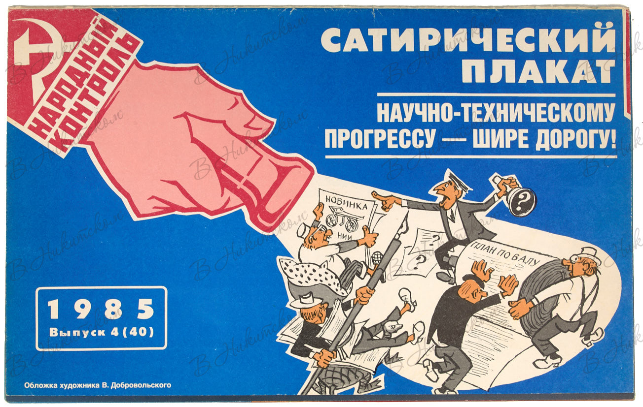 Сатирический плакат. Научно-техническому прогрессу шире дорогу! / худ. К. Иванов, А. Резаев, М. Рождествин, С. Сухарев, Ю. Ефимович, В. Добровольский. Вып. 4 (40). 1985.