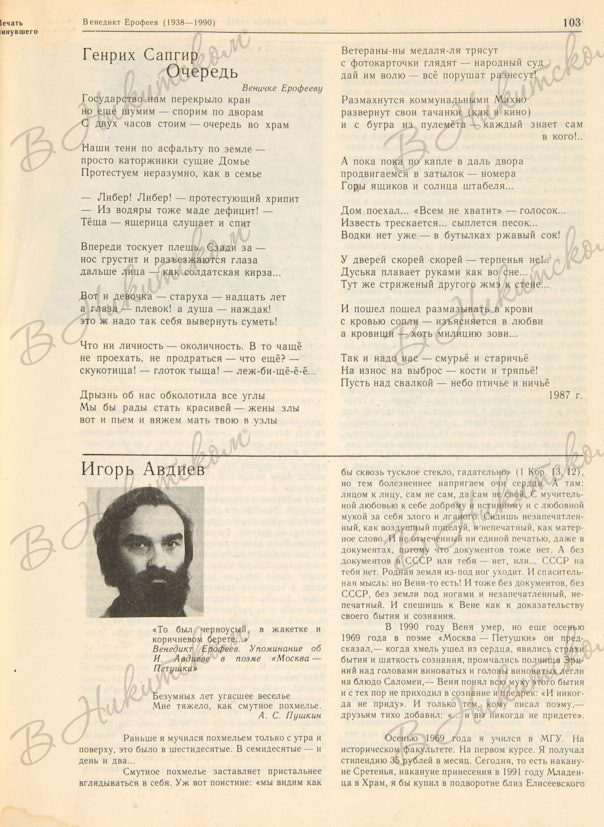 В № 9 (1991 г.) опубликованы материалы о В. Ерофееве: воспоминания его родных, друзей (Н. Фролова, Л. Любчикова, Г. Ерофеева, В. Муравьев, А. Леонтович, О. Седакова, И. Авдиев), фрагменты из записной книжки писателя, статья А. Зорина. В № 9 1992 г. - публикация писем Ерофеева к сестре.