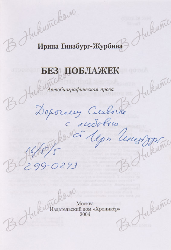 Гинзбург-Журбина, И. [Автограф С.И. Бэлза]. Без поблажек. Автобиографическая проза. М.: Издательский дом «Хроникёр», 2004.