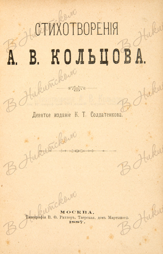 Кольцов, А.В. Стихотворения. 9-е изд. М.: Изд. К.Т. Солдатенкова, 1887.