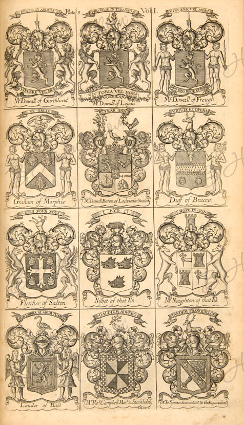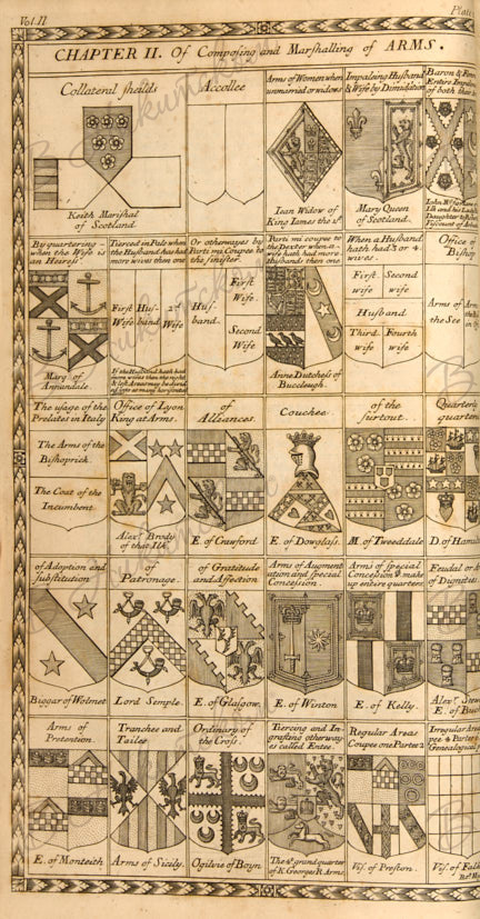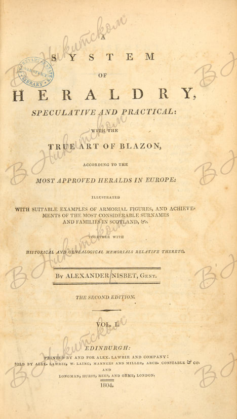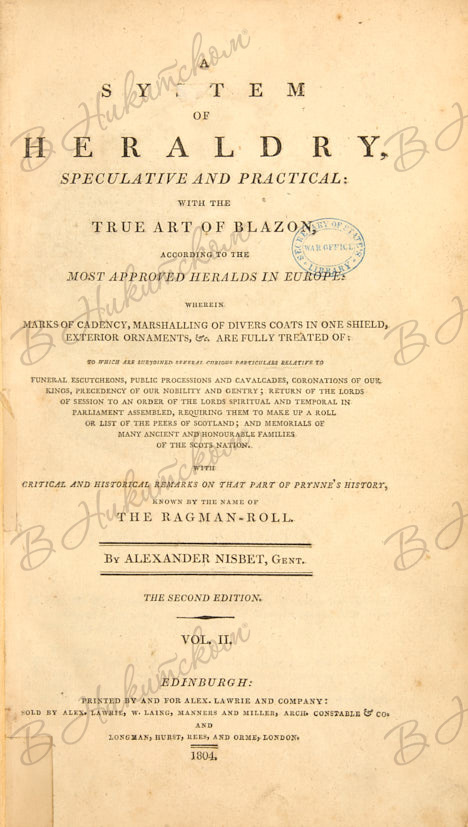 [Нисбет, А. Система геральдики, теория и практика: с искусством составления герба, по мнению самых авторитетных герольдов Европы. C изображением гербов и девизов самых значимых родов и семей Шотландии, с приложением исторических и генеалогических памятников, относящимися к ним]. Nisbet, Alexander. A system of heraldry, speculative and practical: with the true art of blazon, according to the most approved heralds in Europe; illustrated with suitable examples of armoria figures, and achievements of the most considerable surnames and families in Scotland, together with historical and genealogical memorials relative thereto. 2-е изд. В 2 т. Т. 1-2. Edinburgh: Alex. Lawrie and Company, 1804.