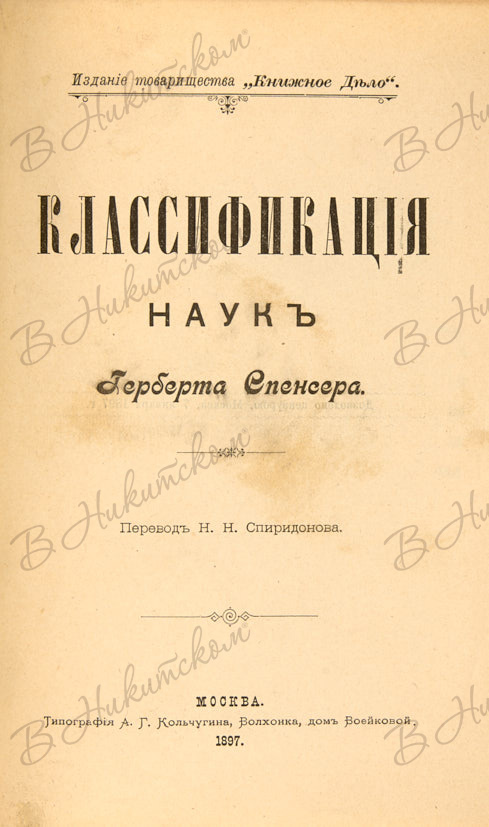 Классификация наук Герберта Спенсера / перевод Н.Н. Спиридонова. М.: Типография А.Г. Кольчугина, 1897.