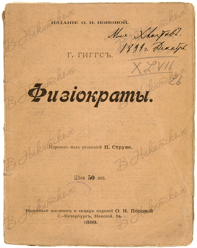[Экземпляр историка М.М. Хвостова]. Гиггс, Г. Физиократы. Французские экономисты XVIII века / перевод с англ. О.Ю. Гофман; под ред. П. Струве. СПб.: Издание О.Н. Поповой, 1899.