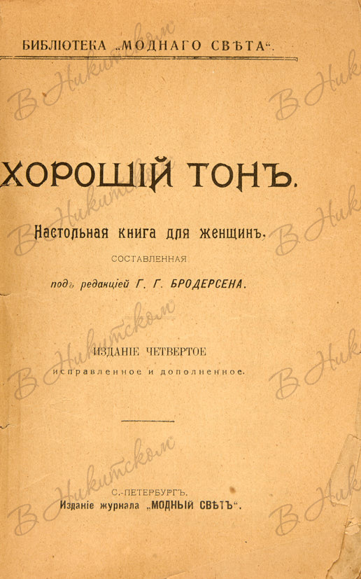 [Библиотека «Модного света»]. Хороший тон / Настольная книга для женщин, составленная под ред. Г.Г. Бродерсена. Издание 4-е, исправл. и дополн. СПб.: Издание журнала «Модный свет»; тип. Т-ва «Екатерингофское Печатное Дело», [1900-ые гг.].