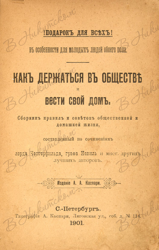 Как держаться в обществе и вести свой дом. Подарок для всех! В особенности для молодых людей обоего пола. Сборник правил и советов общественной и домашней жизни / сост. по соч. лорда Честерфильда, графа Невиль и многих других лучших авторов. СПб.: А.А. Каспари, 1901.