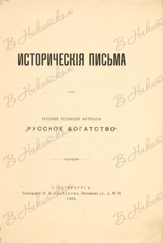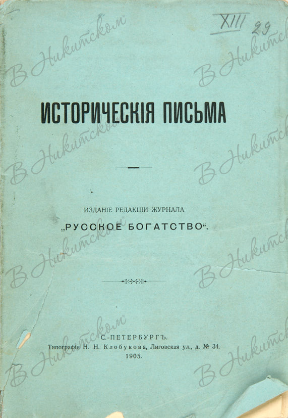 Исторические письма. СПб.: Издание редакции журнала «Русское богатство»; типография Н.Н. Клобукова, 1905.