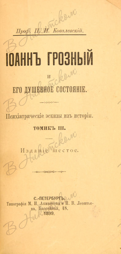 1. Ковалевский, П.И. Иоан Грозный и его душевное состояние. (Психиатрические эскизы из истории. Т. 3). 6-е изд. СПб.: Тип. М.И. Акинфиева и И.В. Леонтьева, 1899. [2], II, [2], 9-292 с.