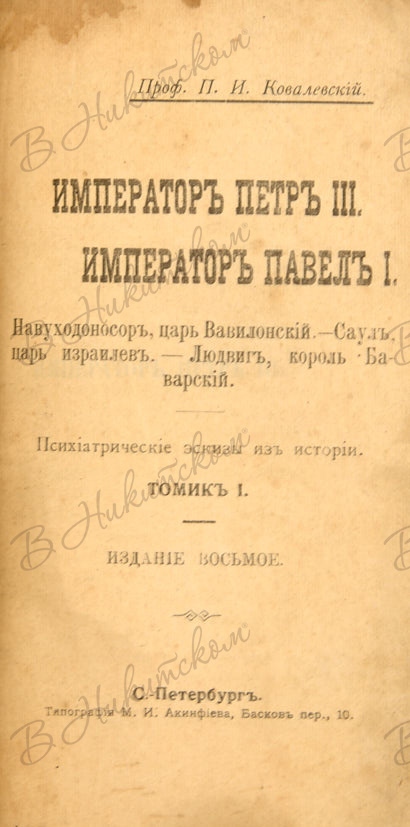 2. Ковалевский, П.И. Император Петр III. Император Павел I. Навуходоносор, царь Вавилонский. Саул, царь израилев. Людвиг, король Баварский. (Психиатрические эскизы из истории. Т. 1). 8-е изд. СПб.: Тип. М.И. Акинфиева, [1907?]. 3-314 с.
