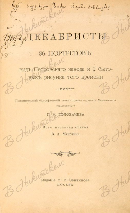 Декабристы. 86 портретов, вид Петровского завода и 2 бытовых рисунка того времени / пояснит. текст П.М. Головачева; вступ. ст. В.А. Мякотина. М.: Издание М.М. Зензинова, 1906.