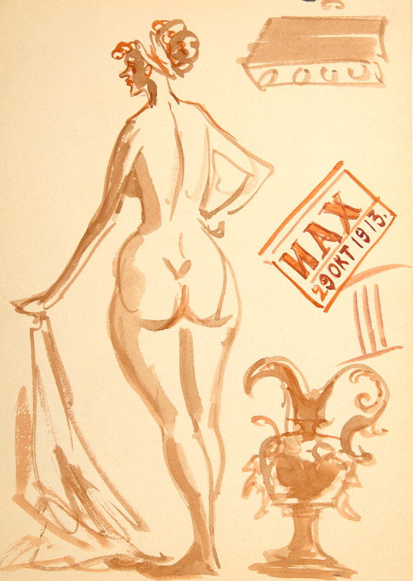 На обороте натурщица в Императорской Академии Художеств. Кисть, гуашь. Ранее в собрании Б. Д. Суриса.