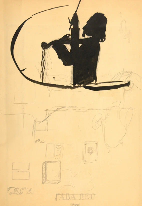 Портрет композитора П. И. Чайковского. Силуэт. Двусторонняя композиция. 1940 г. Карандаш, тушь, перо, белила, 32×22 см.