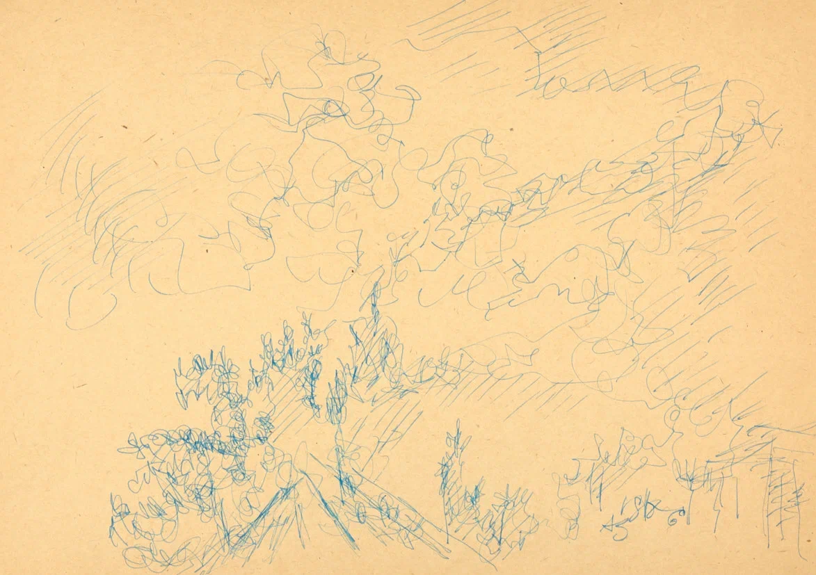 Лот из рисунка, 8 стихотворных импровизаций и фотография негатива А. Зверева и С. Бордачева. 1. Рисунок: «Июльский полдень». 1986 г. Бумага, перьевая ручка 21×29,5 см.