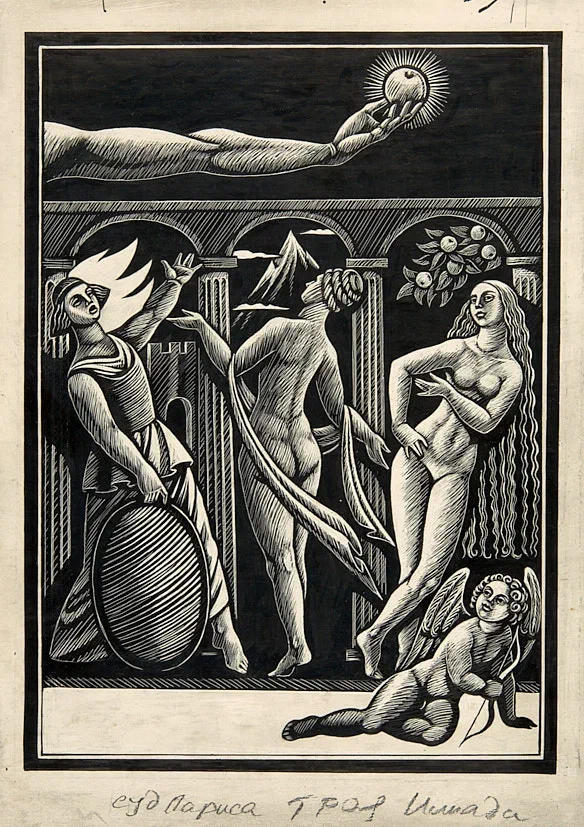 Суд Париса. Иллюстрация к книге Н. Куна «Легенды и мифы Древней Греции». 1981 г. Бумага, тушь, перо, процарапывание (граттаж), 23,8×17,5 см.