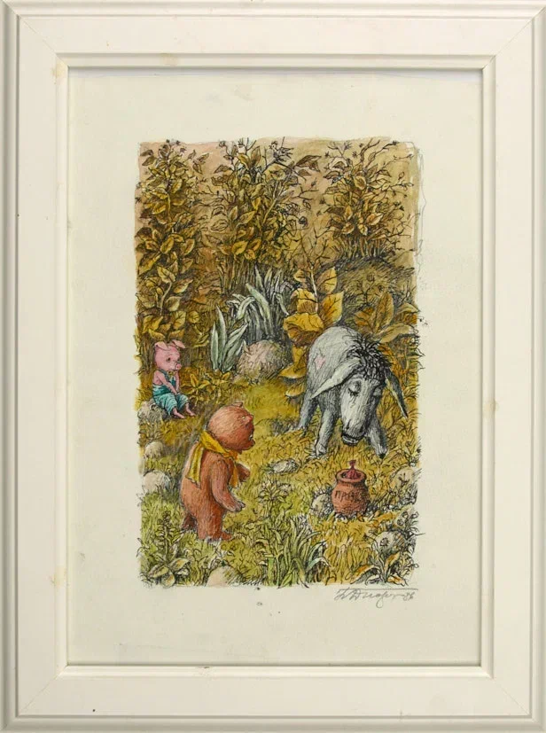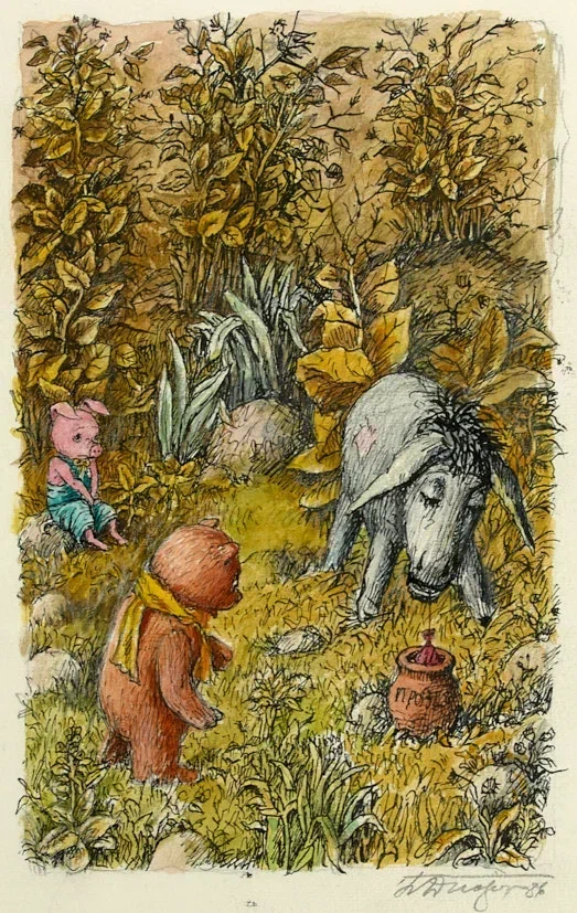 Иллюстрация к сказке Алана Милна «Винни–Пух и все–все–все» в переводе Б. Заходера. Винни–Пух, ослик Иа и Пятачок. 1986 г. Бумага, тушь, перо, акварель, 28×20 (лист); 22×13 см. (изображение).