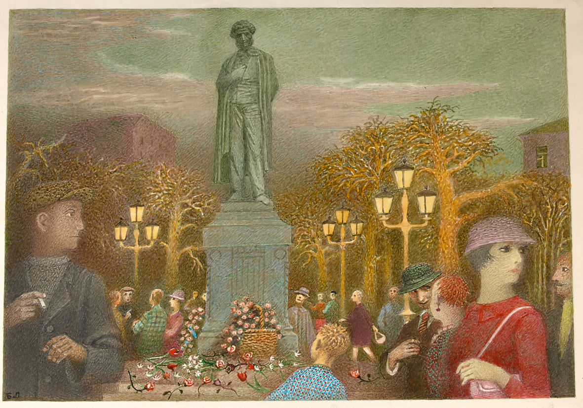 У памятника Пушкину. 2000-е гг. Тушь, акварель, гуашь, 39×56 см.