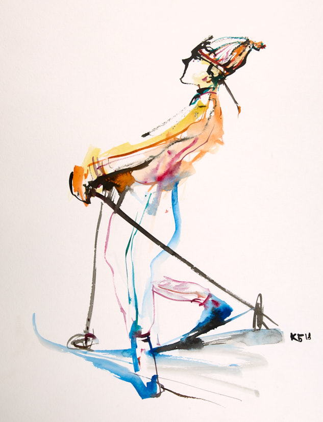 Лыжница в желтой куртке. 2018 г. Бумага, акварель, 42×29,5 см.
