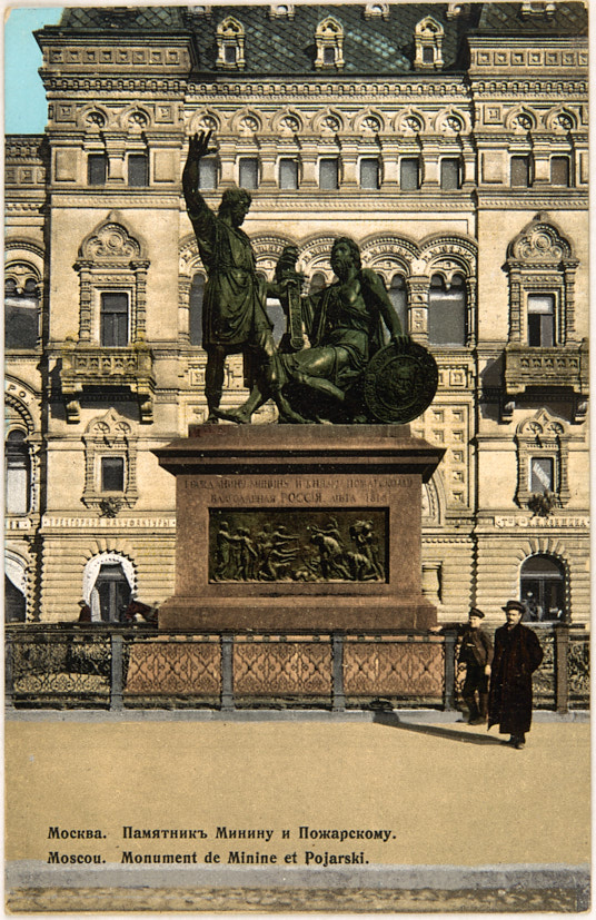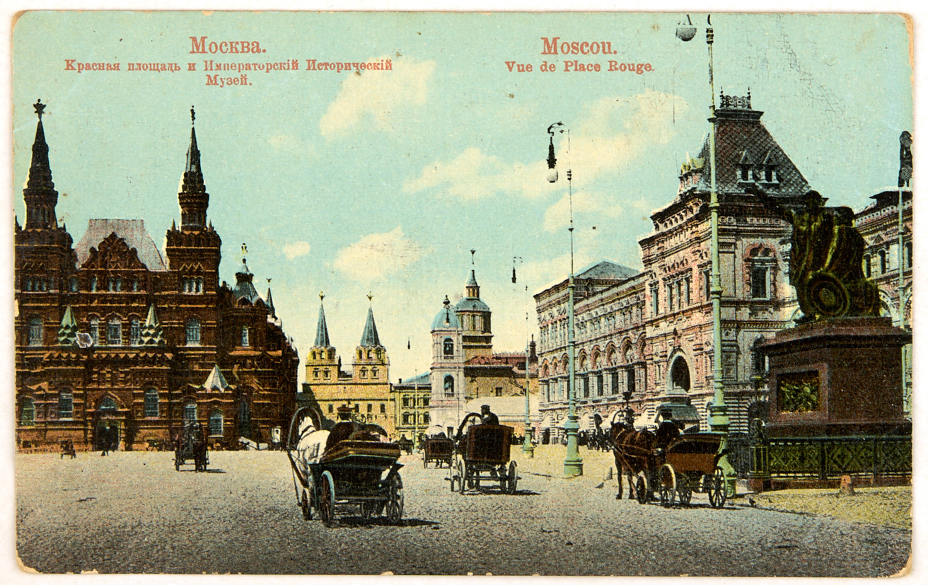 Лот из двух цветных видов Москвы: Красная площадь, Государственный исторический музей, памятник Минину и Пожарскому. Начало XX в. Всемирный почтовый союз. Издание П. фон Гиргенсон. Москва. 14×9 см.